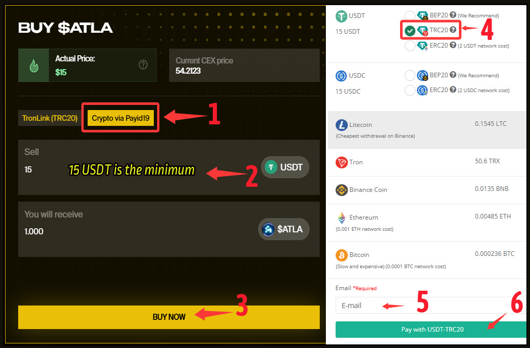 STEP 2:  Log in to the “Dashboard,” select “Crypto via Payid19” to pay with USDT or other cryptocurrencies, and purchase $ATLA, 15 USDT is the minimum ( If you have a TronLink wallet, you can log in and pay directly through your wallet ).